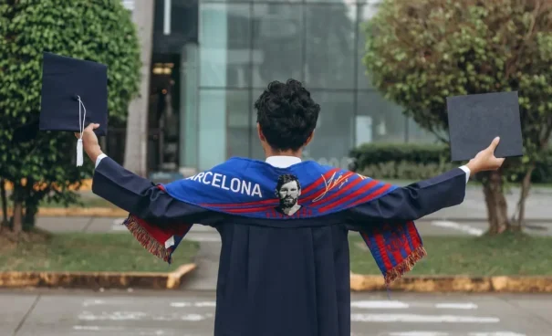Graduate celebrating graduation day with lionel messi scarf.